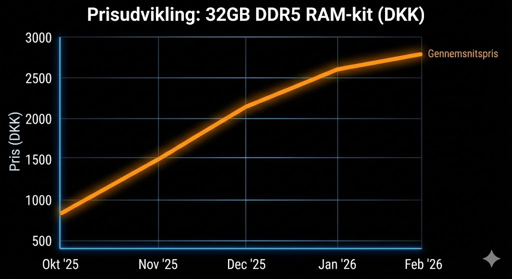 Grafen herunder illustrerer den kraftige prisstigning for et typisk 32 GB DDR5-kit på det danske marked.